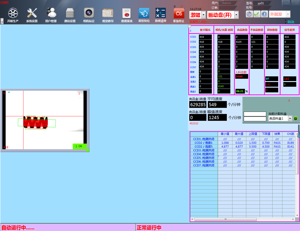 檢測方法:采用背光照明,通過CCD獲取到彈簧的清晰輪廓圖片。彈簧外觀要檢測的項目包含:有無橫向拉伸變形、有無縱向拉伸變形、有無斷裂等。這些檢測項目可以通過軟件中的"區域對比"及"測量"功能來共同完成。相比傳統的人工檢測方法,該方法檢測速度快,精度更高,可靠性更強。