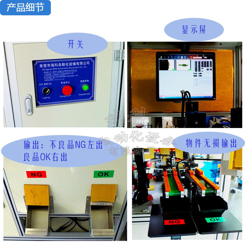 硬體配備包含振動送料機、下料軌道、檢驗平台、計算機係統為一安全、便利,且節省人力成本的自動化設備。分別介紹如下: